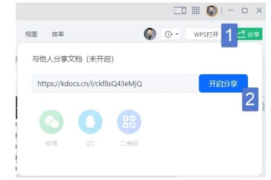 接下来单击右上角的【分享】→【开启分享】,OK,现在就可以将链接发给需要共同编辑的小伙伴们了,如果再单击下方的【微信】【QQ】或者【二维码】按钮,可以将链接直接转换为二维码,扫码就可以进行共同编辑。还可以根据需要设置编辑权限以及分享的有效期。