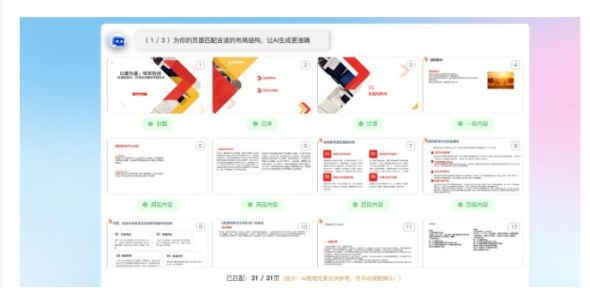 只要上传成功,AI就开始自动分析推理了。系统会自动识别每页内容的逻辑类型(封面、过渡、多段内容、团队介绍、里程碑、逻辑结构、数据展示等等),如果识别的结构和你预期的有出入,可以手动点击按钮进行替换。毕竟AI也不是万能的,要更好的效果还是自己再确认下。
