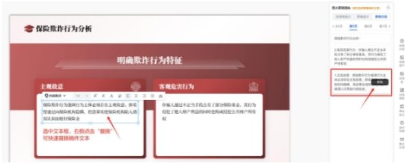 【原文替换】AI对内容的整理,输出的结果总是不可控,我们可以选择要修改的文本,在右侧要替换的内容位置点“替换”,就可以一键替换内容。