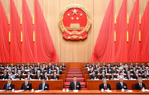 人民大会堂大礼堂气氛庄重热烈,主席台帷幕正中的国徽与会场穹顶上的五角星灯交相辉映。